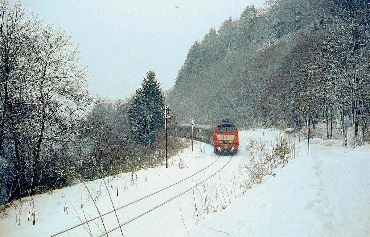 Winter im Bayerischen Oberland 2: 218 312-7 fährt Anfang Januar 1986 oberhalb von Neuhaus mit einem Nahverkehrszug nach München