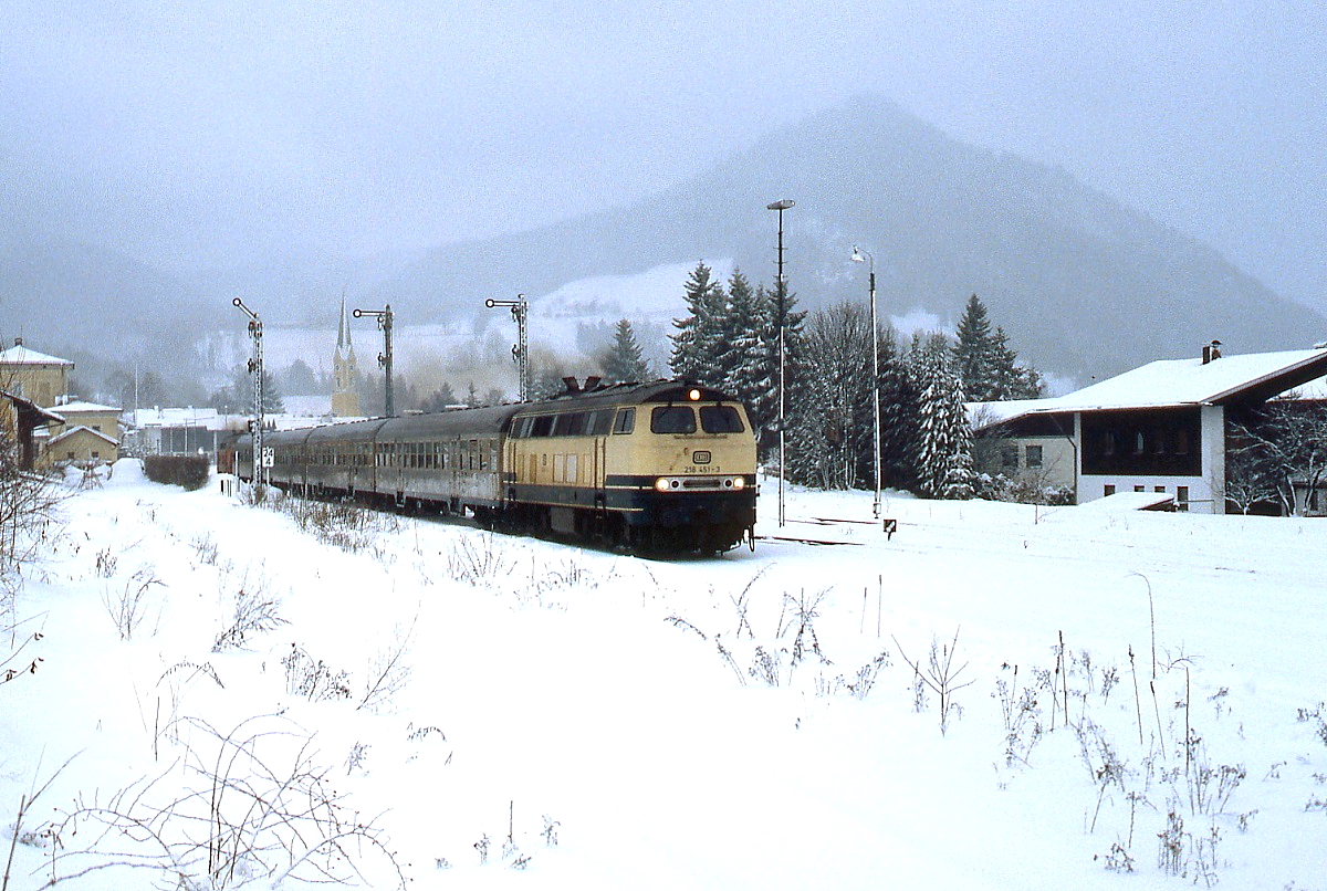 Winter im Bayerischen Oberland 2: In der Regel verließen die 218-Wendezüge den Kopfbahnhof Schliersee mit dem Steuerwagen voraus in Richtung München bzw. Bayrischzell. Anfang Januar 1991 verkehrte ausnahmsweise ein 218-Sandwich und so konnte die führende 218 451-3 mit den charakteristischen Ausfahrsignalen einmal aus der anderen Richtung aufgenommen werden.