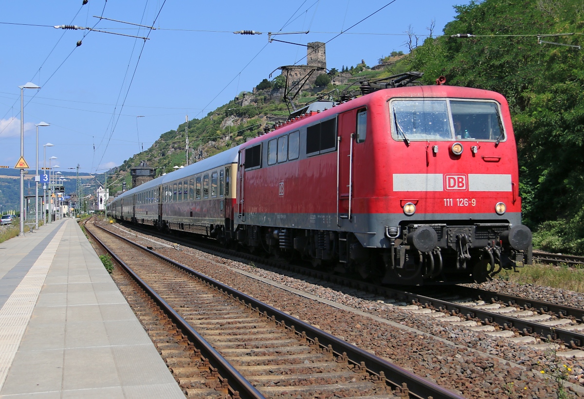 111 126-9 bespannte am 16.07.2015 den Rheingoldzug in Richtung Rüdesheim. Aufgenommen in Kaub am Rhein.