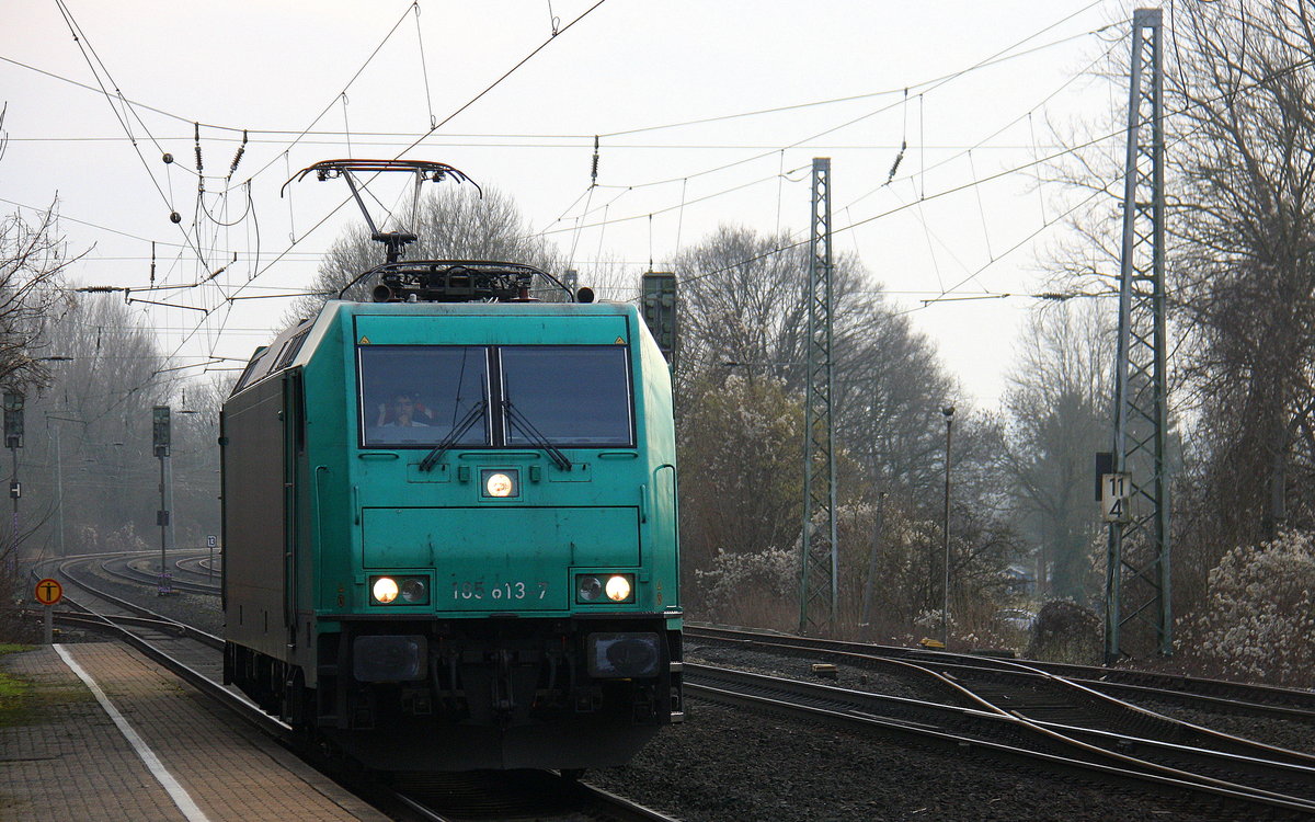 185 613-7 von Crossrail kommt aus Richtung Aachen-West,Laurensberg,Richterich und fährt durch Kohlscheid und fährt als Lokzug aus Aachen-West nach Krefeld-Hbf und fährt in Richtung Herzogenrath.