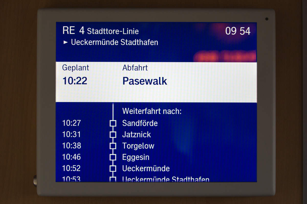 Anzeigetafel im RE 4 zum Ueckermünder Stadthafen. - 19.01.2017