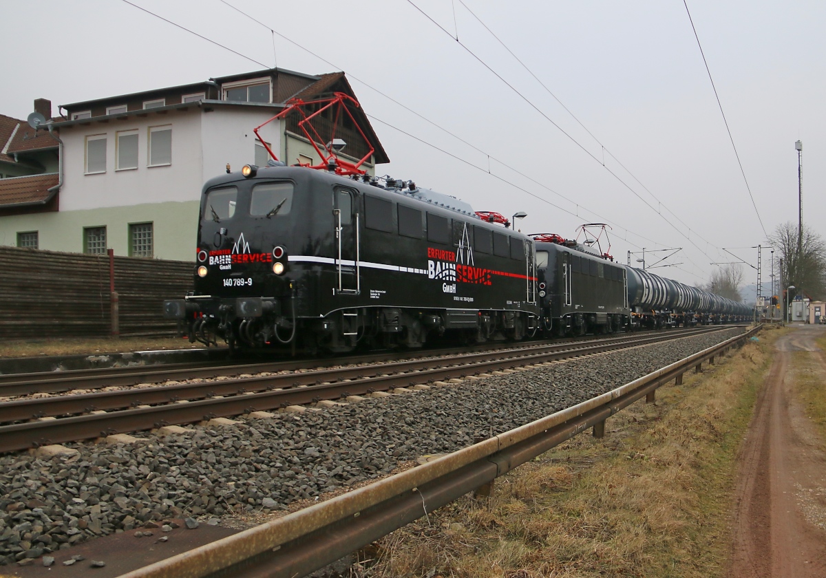 Black ist beautiful! Die neu gestalteten EBS 140 789-9 in Doppeltraktion mit 140 772-5 und Kesselwagenzug in Fahrtrichtung Süden. Aufgenommen in Ludwigsau-Friedlos am 12.02.2017.