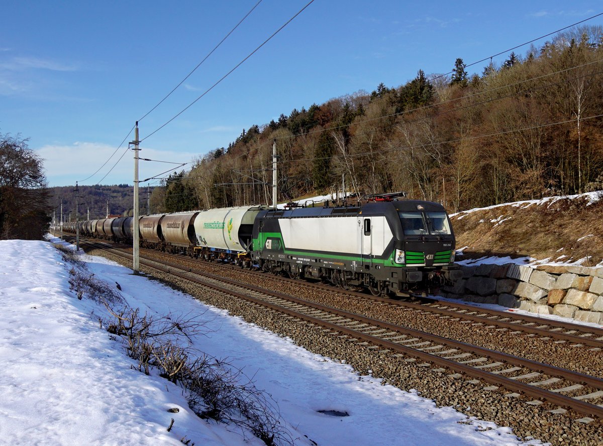 Die 193 242 mit einem Getreidezug am 05.02.2017 unterwegs bei Wernstein.