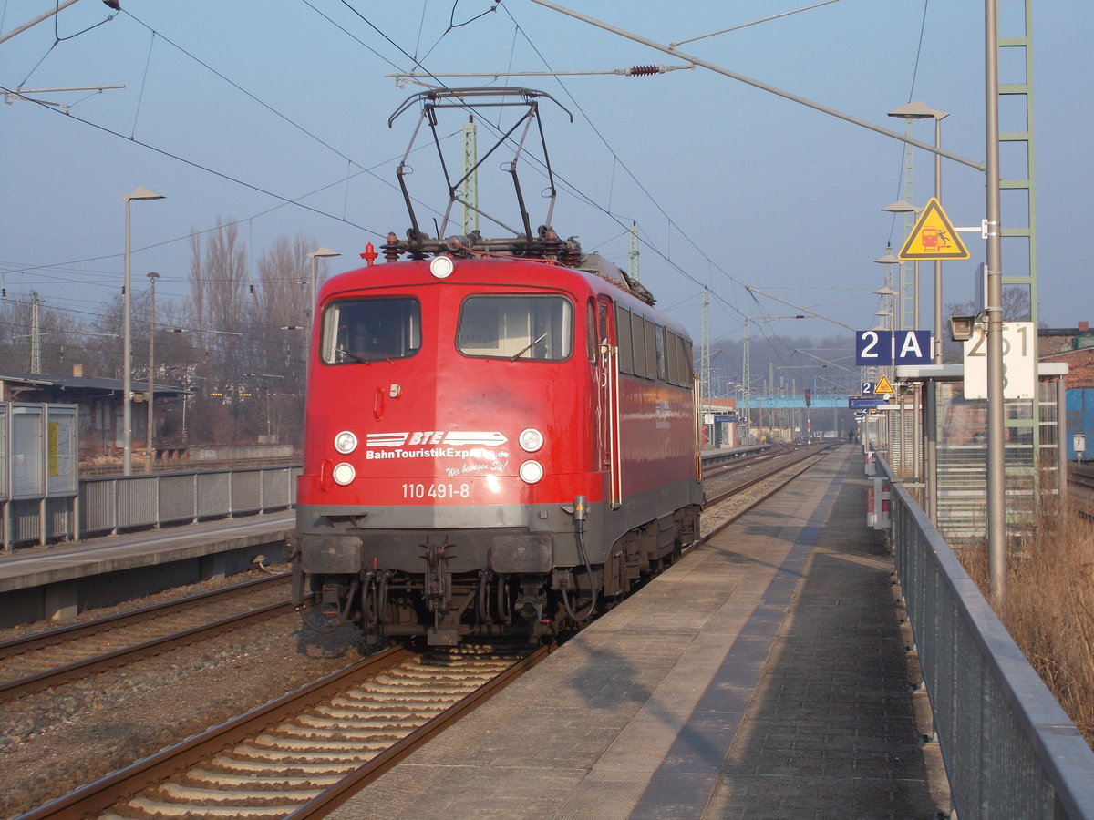 Die BTE 110 491 mußte wegen einem haltzeigenden Ausfahrsignal,am 01.Februar 2017,in Bergen/Rügen halten.Danach ging es nach Mukran wo es einen Tag später nach Hamburg mit Autotransportwagen wieder zurück ging.