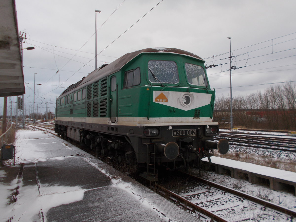 Die SBW V300.002,am 07.Februar 2017,fotogerecht am Bahnsteig in Mukran Mitte.
