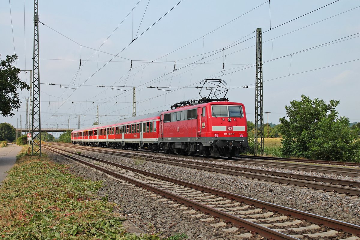 Nachschuss am 10.08.2015 auf die Freiburger 111 062-6 "Neuenburg am Rhein", welche an diesem Tag ihre RB (Basel Bad Bf - Offenburg) aus dem Bahnhof von Müllheim (Baden) in Richtung Buggingen schiebte.