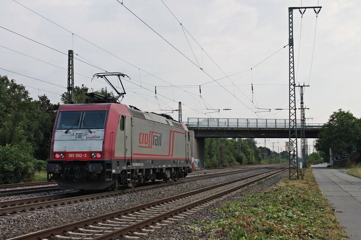 Nachschuss auf die Beacon Rail/Crossrail 185 592-3, welche am 10.08.2015 als Lokzug durch den Bahnhof von Müllheim (Baden) in Richtung Schweiz fuhr.