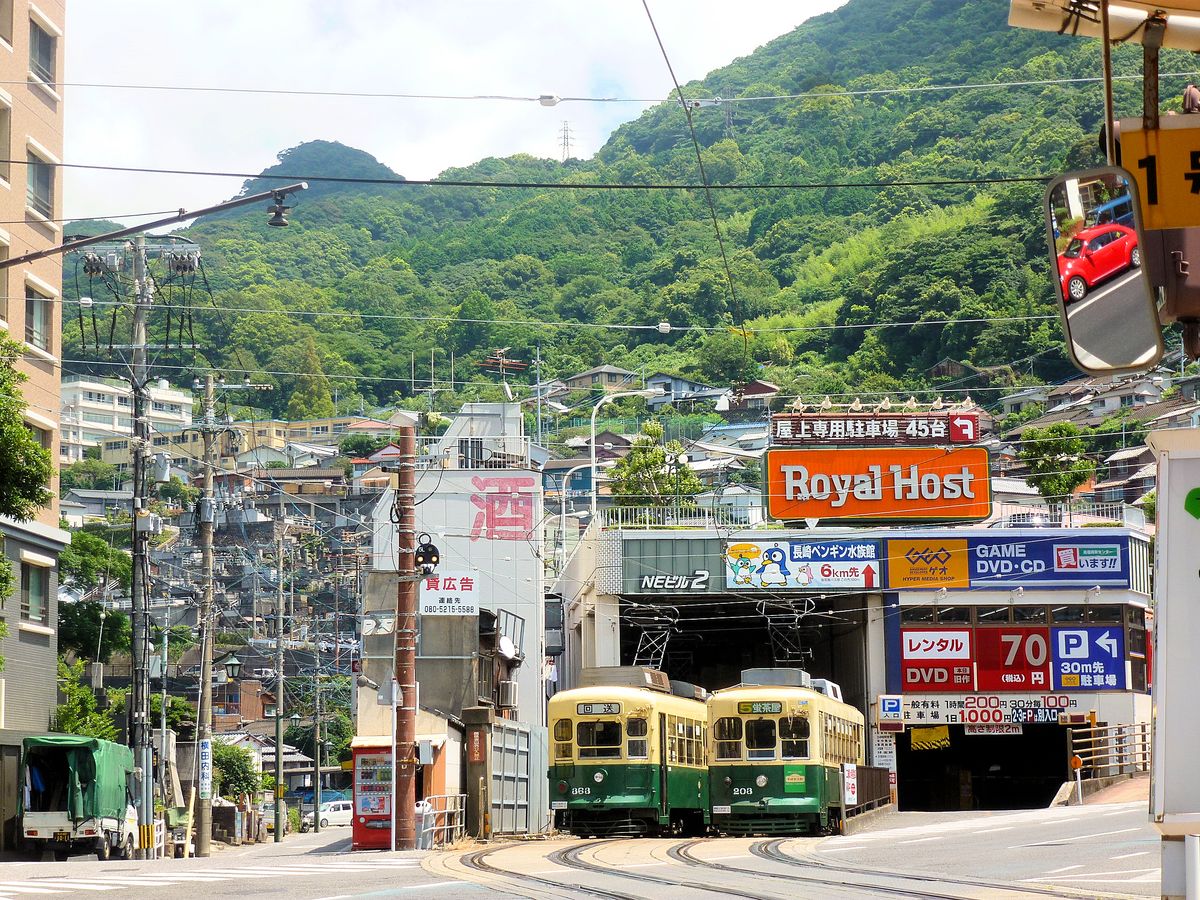 Nagasaki Strassenbahn - Allgemeines: 1435 mm-Spur, 600 V Gleichstrom. Insgesamt 11, 5km Strecken, in der Innenstadt, 3 Zweige zum Fuss der steilen Gebirge im Osten der Stadt, und eine Strecke (5,1 km) talaufwärts via Urakami nach Akasako im Norden der Stadt. Nagasaki schmiegt sich in eine Bucht im sehr zerklüfteten Küstengebiet im äussersten Westen Japans. Ab 1543 stark portugiesisch geprägt; nach vollständiger Abriegelung Japans vom Ausland (um 1637) bestand in Nagasaki der einzige Berührungspunkt Japans mit dem Westen in Form einer kleinen holländischen Niederlassung auf der Insel Dejima in der Bucht. 1859 wieder Oeffnung für westliche Schiffe, 1914 Eröffnung der Strassenbahn, 9.August 1945 vollständige Zerstörung der Stadt beim Abwurf (über Urakami) der zweiten Atombombe (Plutoniumbombe) auf Japan; allein rund 40'000 Todesopfer, von den Verletzten nicht zu reden. Nagasaki hat heute etwa eine halbe Million Einwohner. Im Bild stehen zwei typische Strassenbahnwagen (363 und 203) an der Endstation Hotaru-Jaya im Osten der Stadt. 8.August 2013.