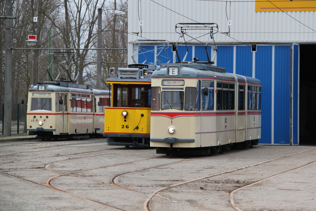 Wagen 46+156,Wagen 26 und Gelenktriebwagen des Typs G4(Wagen 1)waren am Nachmittag vor dem Depot 12 in Rostock-Marienehe.11.02.2017.
