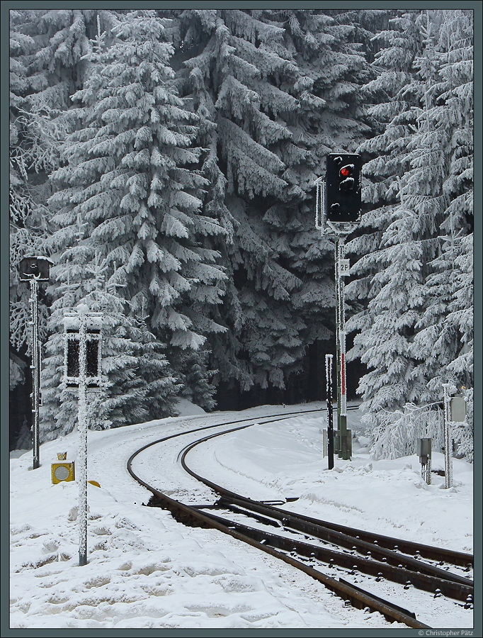 Winter im Harz: Zu sehen ist das Ausfahrsignal des Bahnhofs Schierke Richtung Brocken. Die moderne elektronische Stellwerkstechnik bildet einen deutlichen Kontrast zum touristischen Dampfbetrieb. (11.02.2017)
