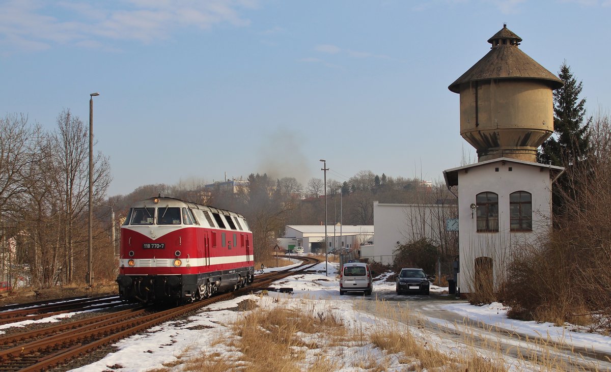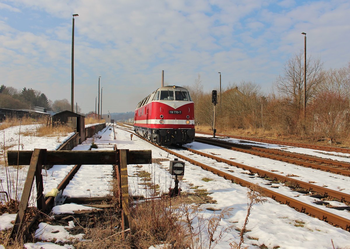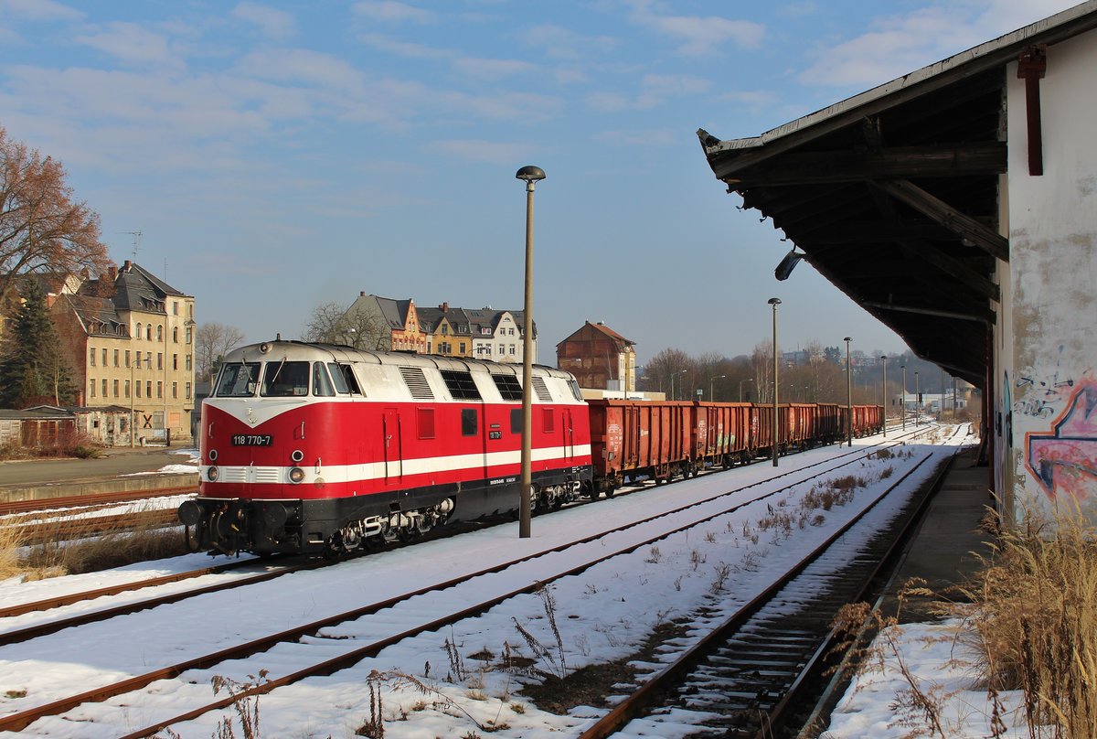 118 770-7 holte am 16.02.17 einen Schrottzug in Plauen/V. bei einem Schrotthändler ab. Hier der Zug in Plauen/V. unterer Bahnhof.