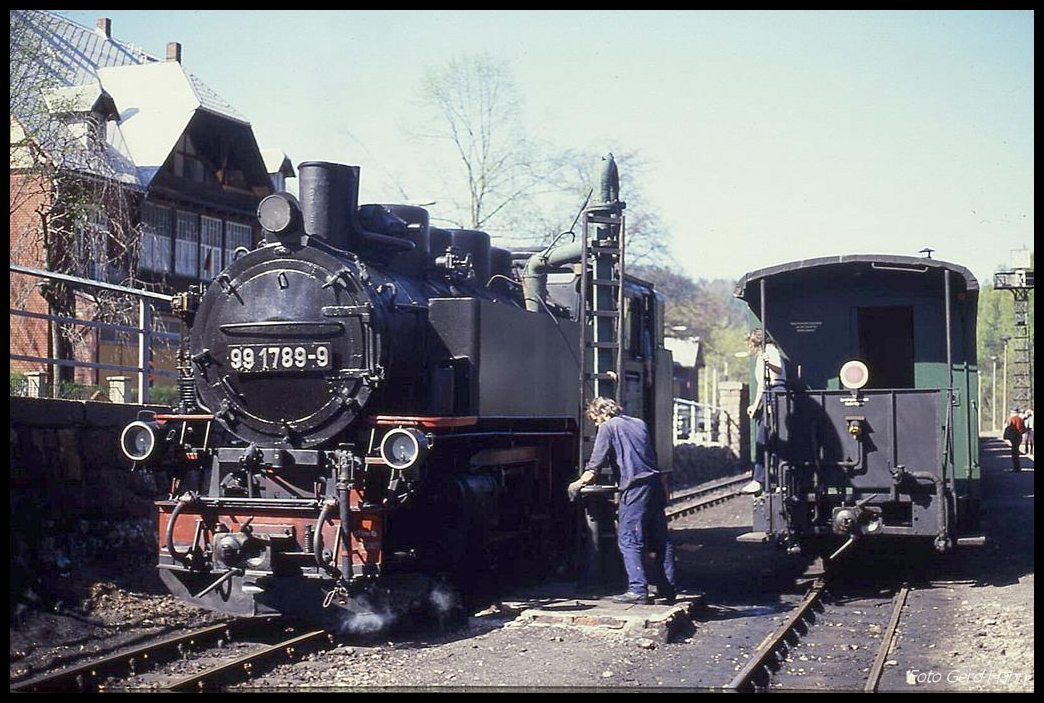Bald wieder möglich!? Am 3.5.1990 nimmt 991789 im schmalspurigen Endbahnhof Kurort Kipsdorf Wasser.