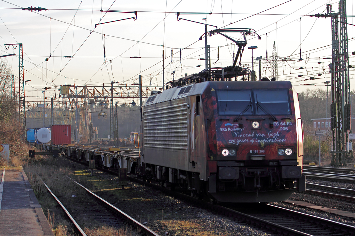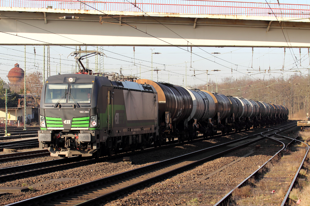 Am späteren Nachmittag des 14.2.2017 kommt die Rurtalbahn 186 423-0 mit einem Kesselwagenzug durch Grevenbroich.