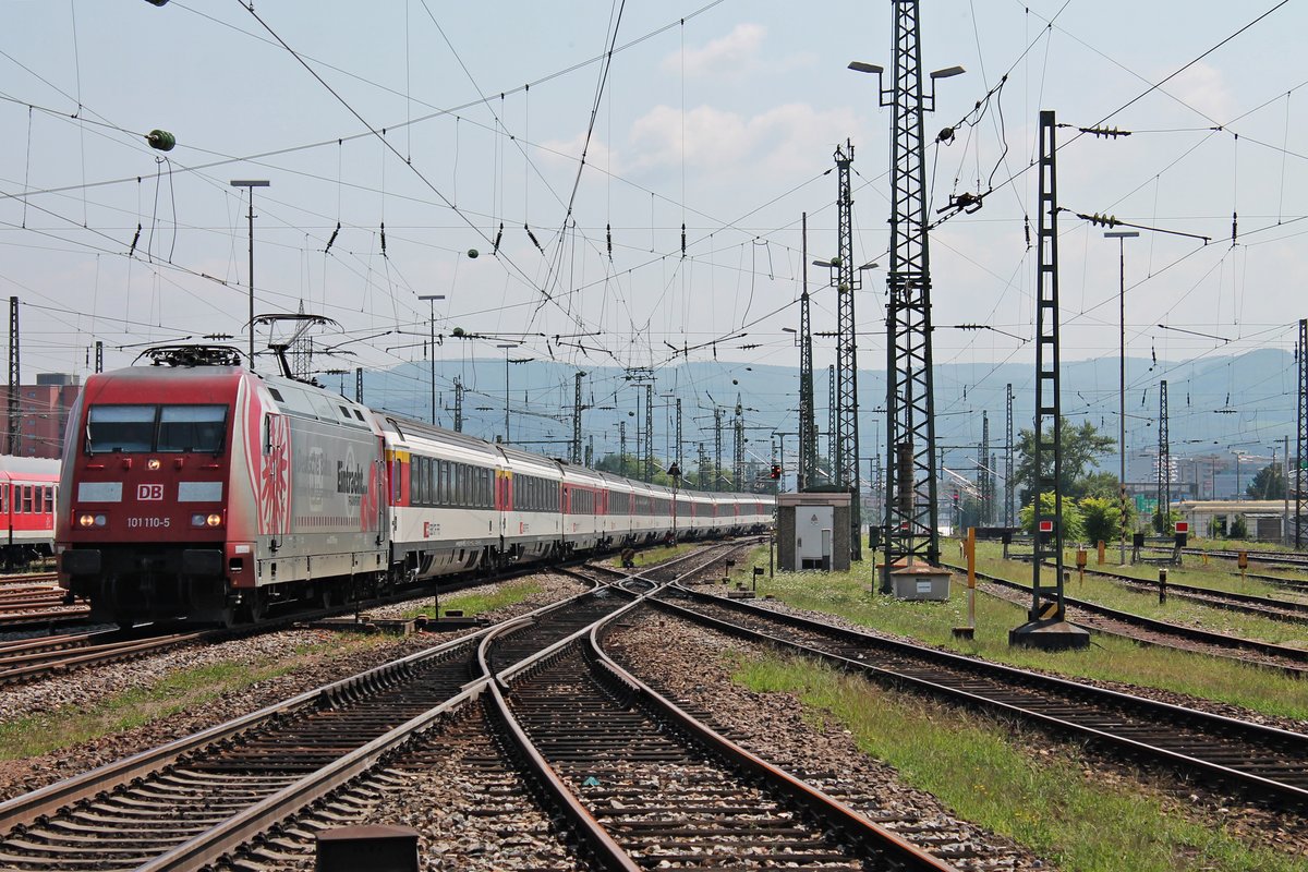 Nachdem sie am Morgen den CNL aus Hamburg/Amsterdam nach Basel SBB bespannte, hing die 101 110-5 "Eintracht Frankfurt" am Mittag des 11.08.2015 nun am EC 6 (Chur HB (Kurswagen)/Zürich HB - Hamburg Altona) um diesen wieder nach Hamburg zu bringen, als sie in den Badischen Bahnhof von Basel einfuhr.