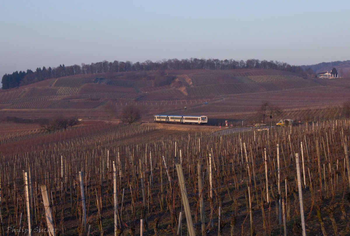 In den Weinbergen bei Burkheim ist SWEG VS 204 zusammen mit VT 128 und 129 am 15.02.2017 als SWE74217 unterwegs.