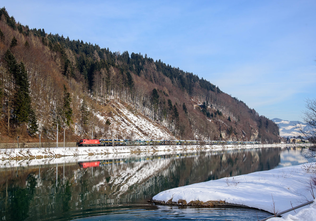 Am 27. Februar 2016 sagten die Vorhersagen bewölktes Wetter voraus. Trotzdem wurde die Fahrt an die Giselabahn gewagt, waren doch insgesamt vier Turnuszüge angekündigt. Bei Brixen im Thale zeigte sich zaghafter Sonnenschein und so legte ich mich dort auf die Lauer. Erster Schizug des Tages war der nur während der Krokus-Ferien in Holland verkehrende D 17498 von Den Haag nach Bischofshofen. Der Zug trägt den Namen  Sneeuw Express  und wurde an diesem Tage von 151 056 ab Wörgl gezogen.