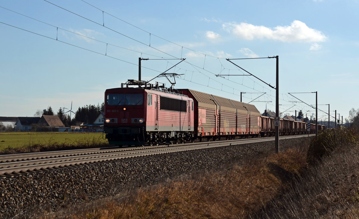 155 065 schleppte am 04.02.17 einen gemischten Güterzug durch Zschortau Richtung Bitterfeld.