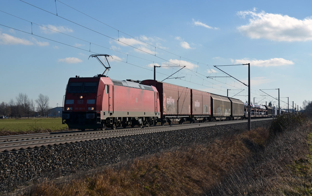 185 261 hat am 04.02.17 in Engelsdorf ihren gemischten Güterzug übernommen und beförderte ihn anschließend durch Zschortau Richtung Bitterfeld.