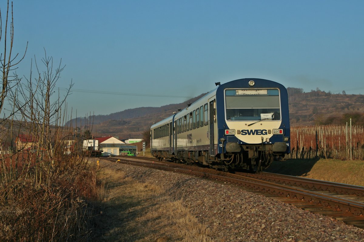 Das NE81-Dreigespann auf der Kaiserstuhlbahn bestand am 15.02.17 aus dem altlackierten Steuerwagen 926 204-8 und den beiden Triebwagen 626 129-0 und 626 128-2. Die Zuggarnitur konnte hier kurz vor Achkarren aufgenommen werden.