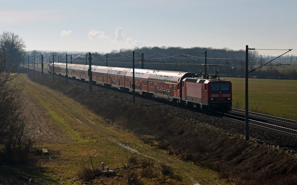 Am 04.02.17 war RB Leipzig zu Gast in Dortmund. Zum Auswärtsspiel fuhr ein DB-Sonderzug mit 143 821 und 143 658 von Leipzig über Magdeburg nach Dortmund. Hier passiert der Sonderzug Zschortau.