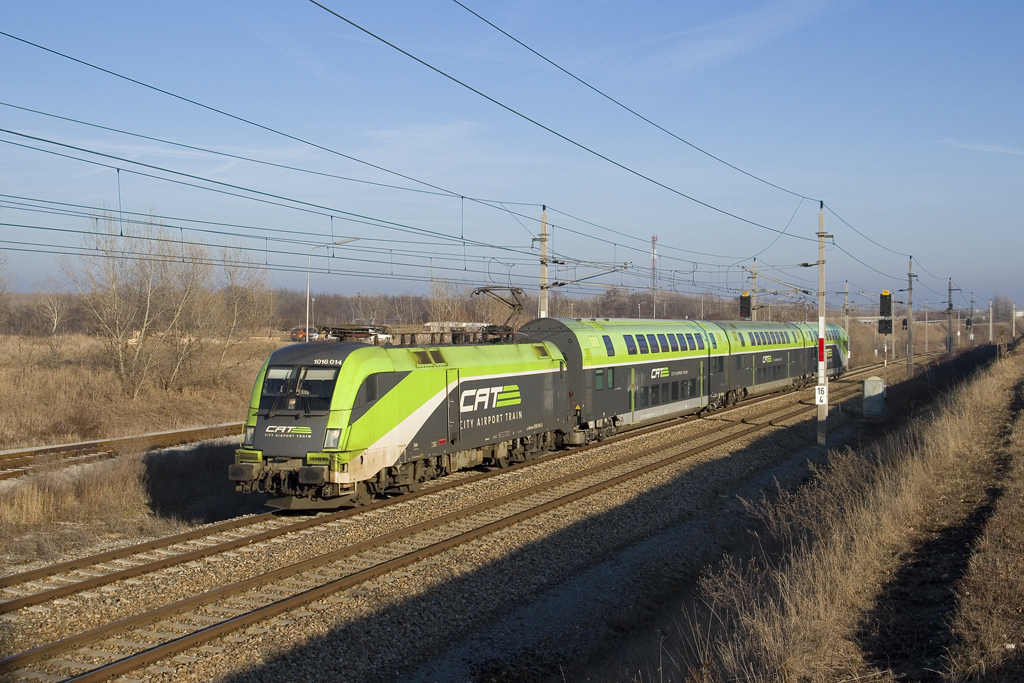 Am 15. Februar 2017 ist 1016 014 mit CAT 9050 von Flughafen Wien (VIE) nach Landstraße - Wien Mitte unterwegs und konnte bei Mannswörth festgehalten werden.
