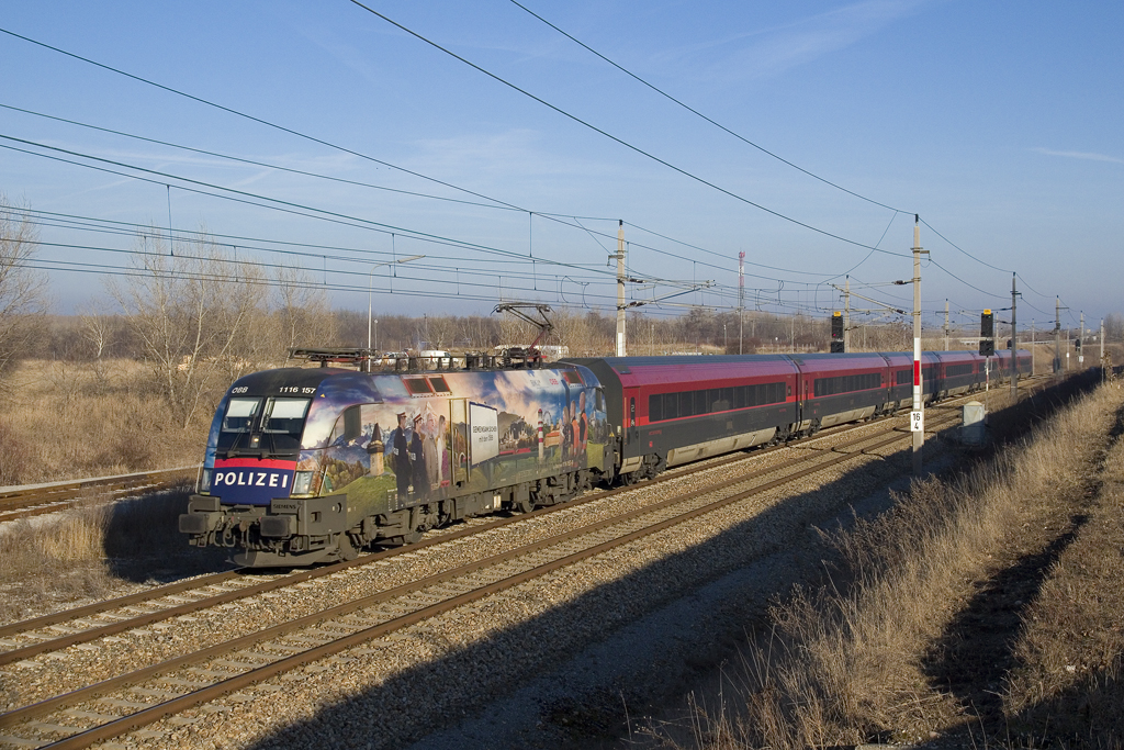 Am 15. Februar 2017 ist 1116 157 "Gemeinsam Sicher" mit dem railjet 740 von Flughafen Wien (VIE) nach Salzburg Hauptbahnhof unterwegs und konnte bei Mannswörth festgehalten werden.