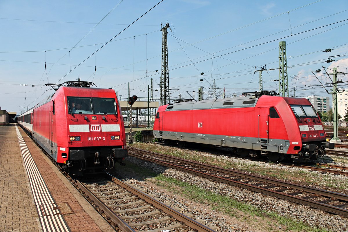 Ausfahrt am 12.08.2015 von 101 007-3 mit dem EC 9 (Hamburg Altona - Zürich HB) aus dem Badischen Bahnhof von Basel in Richtung Basel SBB, als sie an der Abgestellten ex. MET 101 130-3 vorbei fuhr.