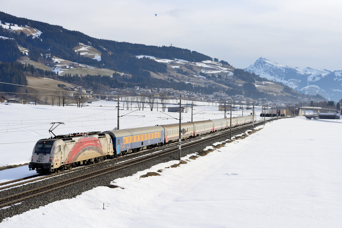 Bilder bei solchen Licht- und Wetterverhältnissen spare ich mir normalerweise. Der am 27. Februar 2016 verkehrende Krokus Express von Schladming nach Den Haag war mir dann aber doch ein Bild wert. Unüblich für einen Turnuszug verkehrt diese Leistung an zwei Wochenenden als Tagesfahrt. Besonders sehenswert ist die reinrassige Garnitur aus belgischen Eurofima-Wagen mit einem WR an der Zugspitze. Und die Krönung war dann noch der Einsatz der SZ 541 016  Albert Einstein  als Zuglok bis Wörgl. Bei Brixen im Thale konnte ich den als 13894 verkehrenden Zug mit Blick auf das Kitzbüheler Horn aufnehmen.
