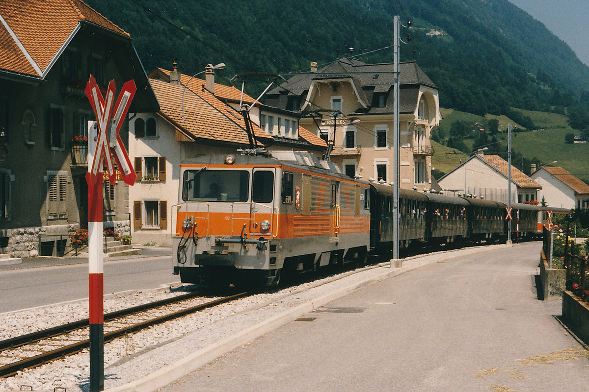 GFM: Sonderzug mit der GDe 4/4 102 bei Grandvillard im Juli 1986.