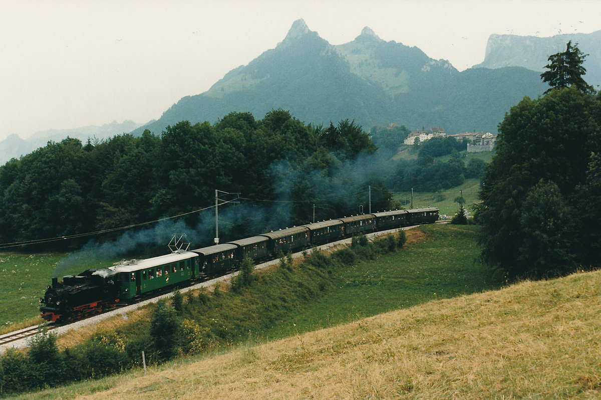 GFM/BC: Sonderzug mit der G 5/5 99.193 und dem Be 4/4 111 bei Gruyères im August 1985. Foto: Walter Ruetsch