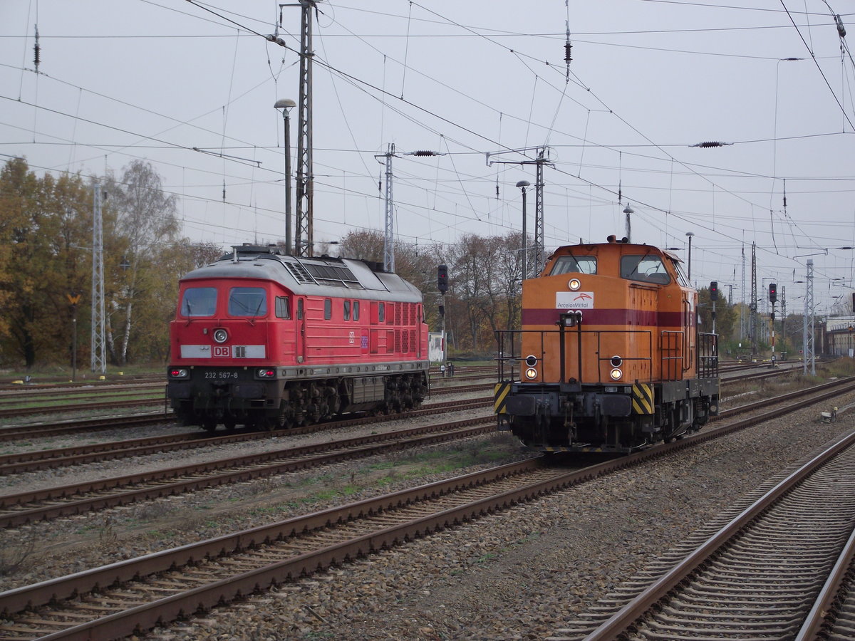 Mitte August 2016 gab es Reichsbahnflair in Oranienburg. Nach dem 232 567-8 eine Schotterleine abstellte und auf ausfahrt wartete, kreuzte eine Ost V100 von Acellor Mittal die Szenerie.