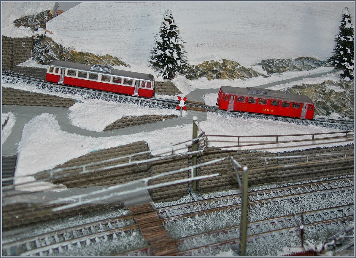 Zwei Bergbahnzüge die üblicherweise infolge ihres Saisonbetriebs kaum mit Schnee in Berührung kommen: der MG Bhm 2/4 und der (im Original nicht verwirklichte) BRB Bhm 2/4. Ze 1:220 / 3mm Spur 13. Feb. 2017