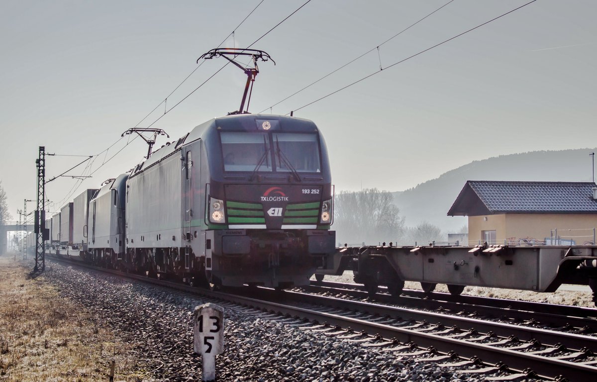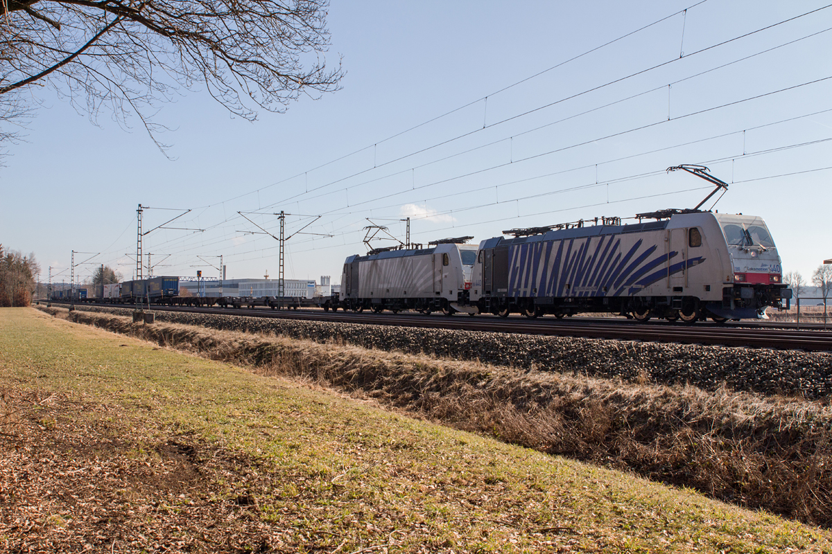 193 252 und ES 64 U2-035 sind mit einen Aufliegerzug in Richtung Norden am 15.02.2017 bei Thüngersheim unterwegs.