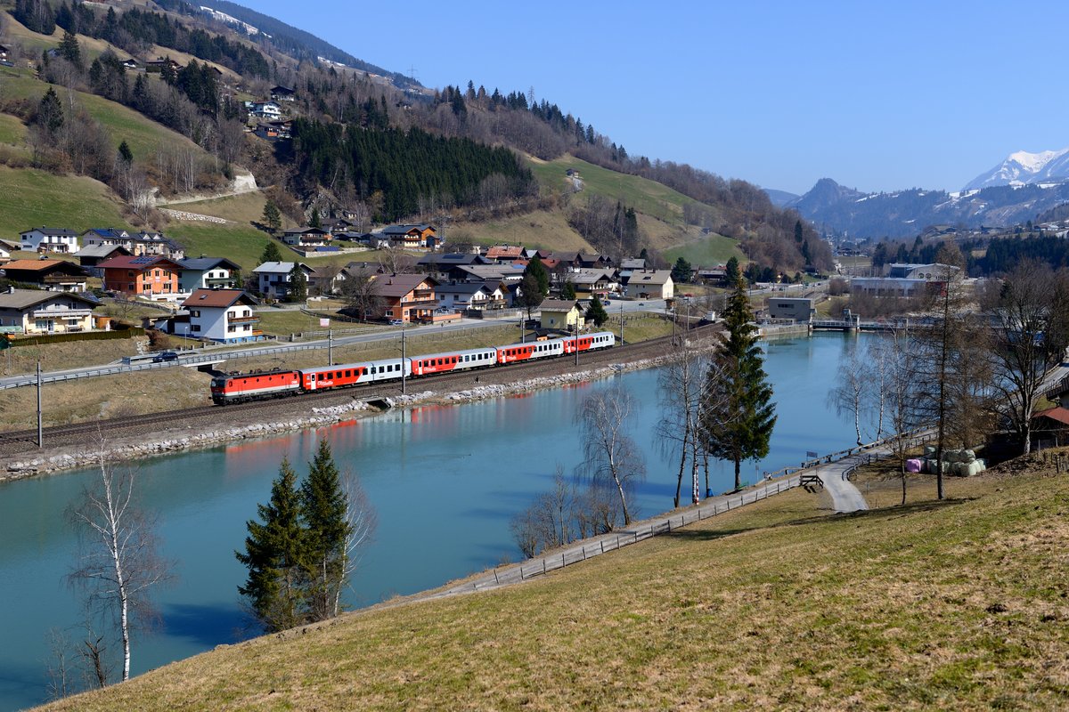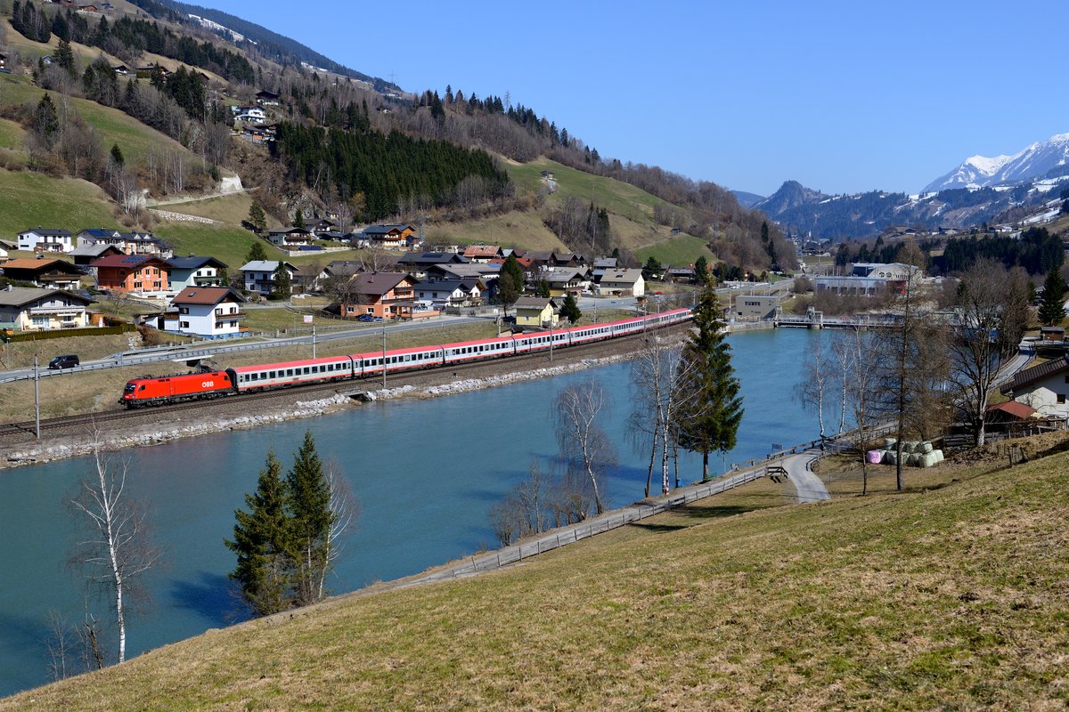 Der EC 164 von Graz HBF nach Zürich HB trägt zumindest in der Schweiz noch den traditionsbeladenen Namen "Transalpin". Am 20. März 2016 konnte ich diesen Fernzug, geführt von 1116.054, bei Högmoos am gestauten Salzachufer aufnehmen.