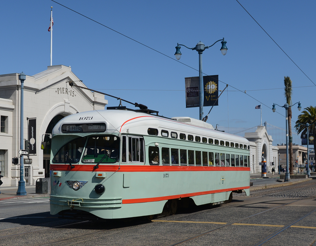 Der ursprünglich aus El Paso stammende PCC-Wagen 1073 war am Nachmittag des 27. April 2016 den Embarcadero in Richtung Jones and Beach unterwegs und wurde von mir vor Pier 15 fotografiert.