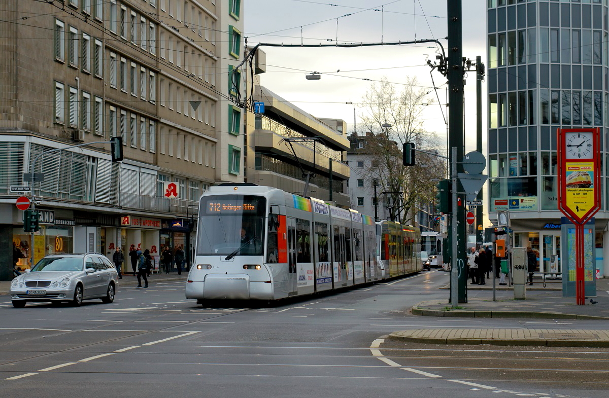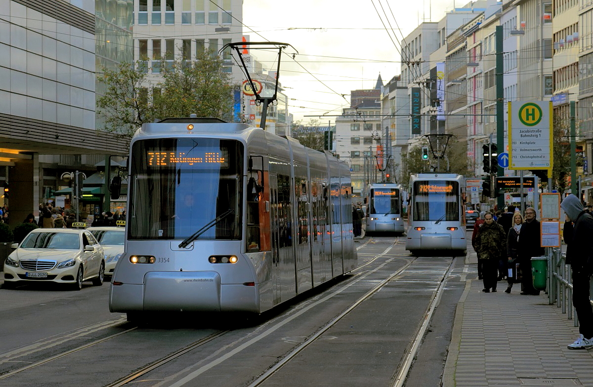 Heute vor einem Jahr, am 20.02.2016, verkehrten letztmals Straßenbahnen auf der innerstädtischen Strecke vom Bilker S-Bahnhof zum Wehrhahn, seitdem geht dies nur noch unter der Oberfläche. Anlass für einen Blick zurück: Die Schadowstraße wurde von mehreren Straßenbahnlinien befahren und so konnten am 28.11.2015 gleich drei NF8U an der Kreuzung mit der Jacobistraße aufgenommen werden, im Vordergrund der NF8U 3354 als Linie 712 nach Ratingen Mitte.