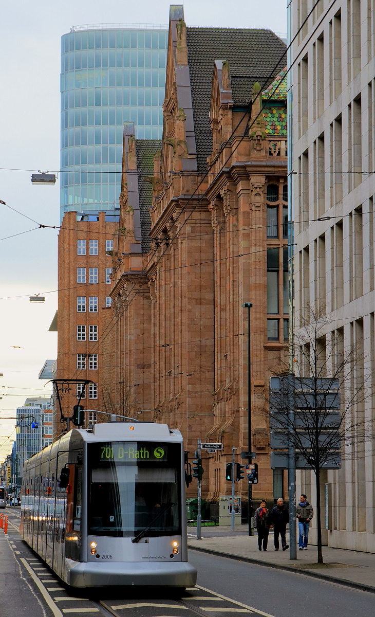 Heute vor einem Jahr, am 20.02.2016, verkehrten letztmals Straßenbahnen auf der innerstädtischen Strecke vom Bilker S-Bahnhof zum Wehrhahn, seitdem geht dies nur noch unter der Oberfläche. Anlass für einen Blick zurück: Der NF10 2006 fährt am 05.12.2015 die Breite Straße entlang. Dahinter die Fassade des 1906 - 1908 errichteten Stahlhofes sowie das Hochhaus GAP 15.