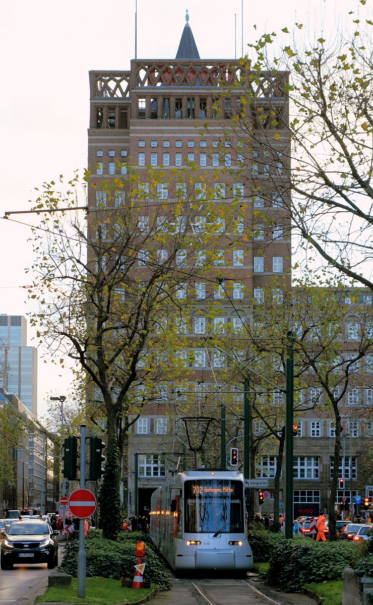 Heute vor einem Jahr, am 20.02.2016, verkehrten letztmals Straßenbahnen auf der innerstädtischen Strecke vom Bilker S-Bahnhof zum Wehrhahn, seitdem geht dies nur noch unter der Oberfläche. Anlass für einen Blick zurück: Als das 57 m hohe Wilhelm-Marx-Haus 1924 fertiggestellt wurde, fuhren schon mehr als ein Viertel Jahrhundert Straßenbahnen auf der Alleestraße, der heutigen Heinrich-Heine-Allee. Seit dem 21.02.2016 ist die Allee komplett straßenbahnfrei, nachdem schon 1988 mit der Inbetriebnahme der Nord-Süd-U-Bahn der oberirdische Betrieb auf dem nördlichen Streckenabschnitt verschwand. Am 28.11.2015 war hier noch der NF8U 3348 unterwegs.