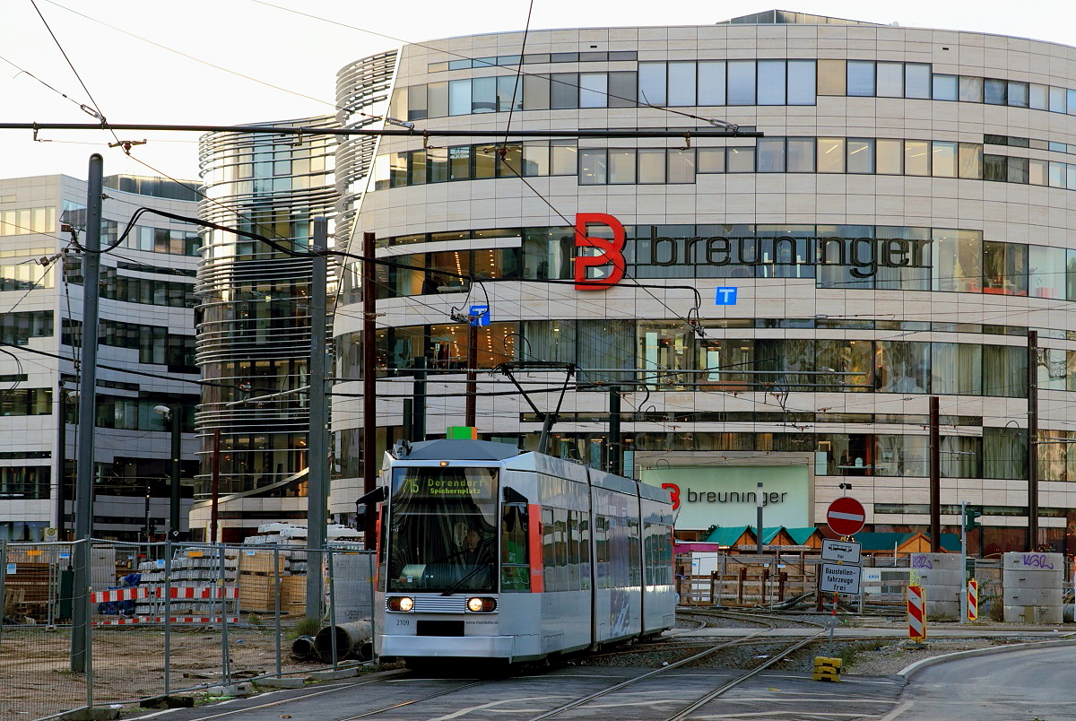 Heute vor einem Jahr, am 20.02.2016, verkehrten letztmals Straßenbahnen auf der innerstädtischen Strecke vom Bilker S-Bahnhof zum Wehrhahn, seitdem geht dies nur noch unter der Oberfläche. Anlass für einen Blick zurück: Vor der Kulisse des vom Architekten Daniel Libeskind entworfenen Kö-Bogens I fährt NF8 2109 am 28.11.2015 in Richtung Schadowstraße. Mit dem Kö-Bogen wurde der frühere bedeutende Straßenbahnknotenpunkt am Jan-Wellem-Platz völlig überbaut.
