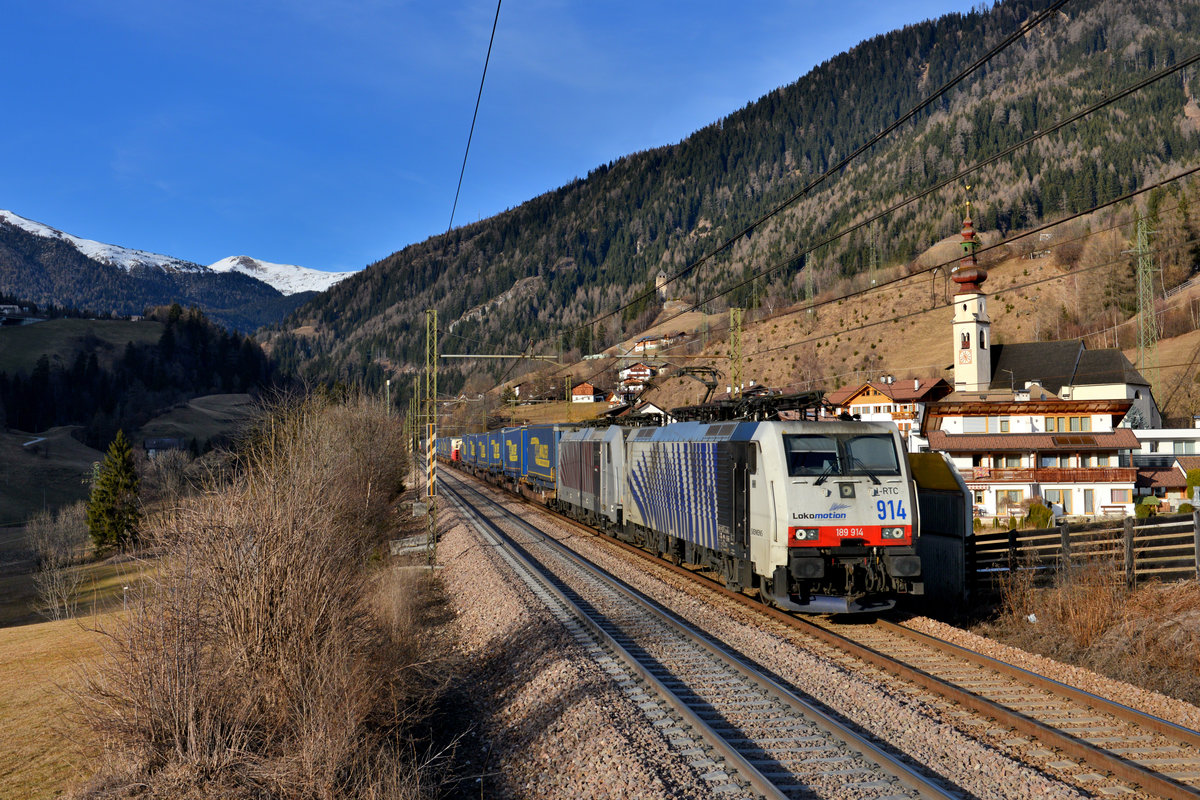 Die 186 440 mit einem KLV-Zug am 25.02.2017 bei der Durchfahrt in Gossensass.