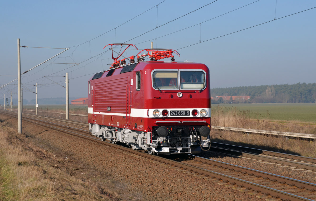 243 650 befand sich am 15.02.17 vom Werk Dessau aus auf der letzten Probefahrt bevor sie an den Eigentümer Deltarail übergeben wurde. Hier rollt sie durch Rodleben Richtung Roßlau zurück zum Aw Dessau.