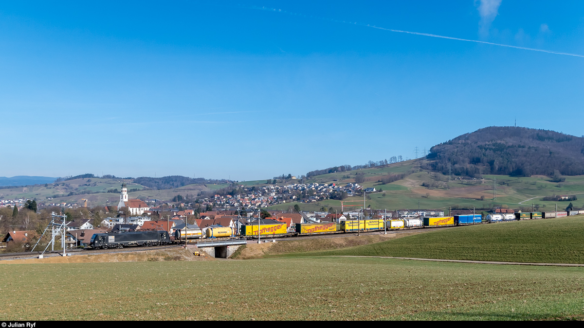 MRCE 189 106 im Dienste für SBB Cargo International mit einem UKV-Zug am 25. Februar 2017 bei Frick.