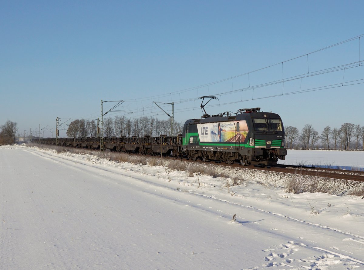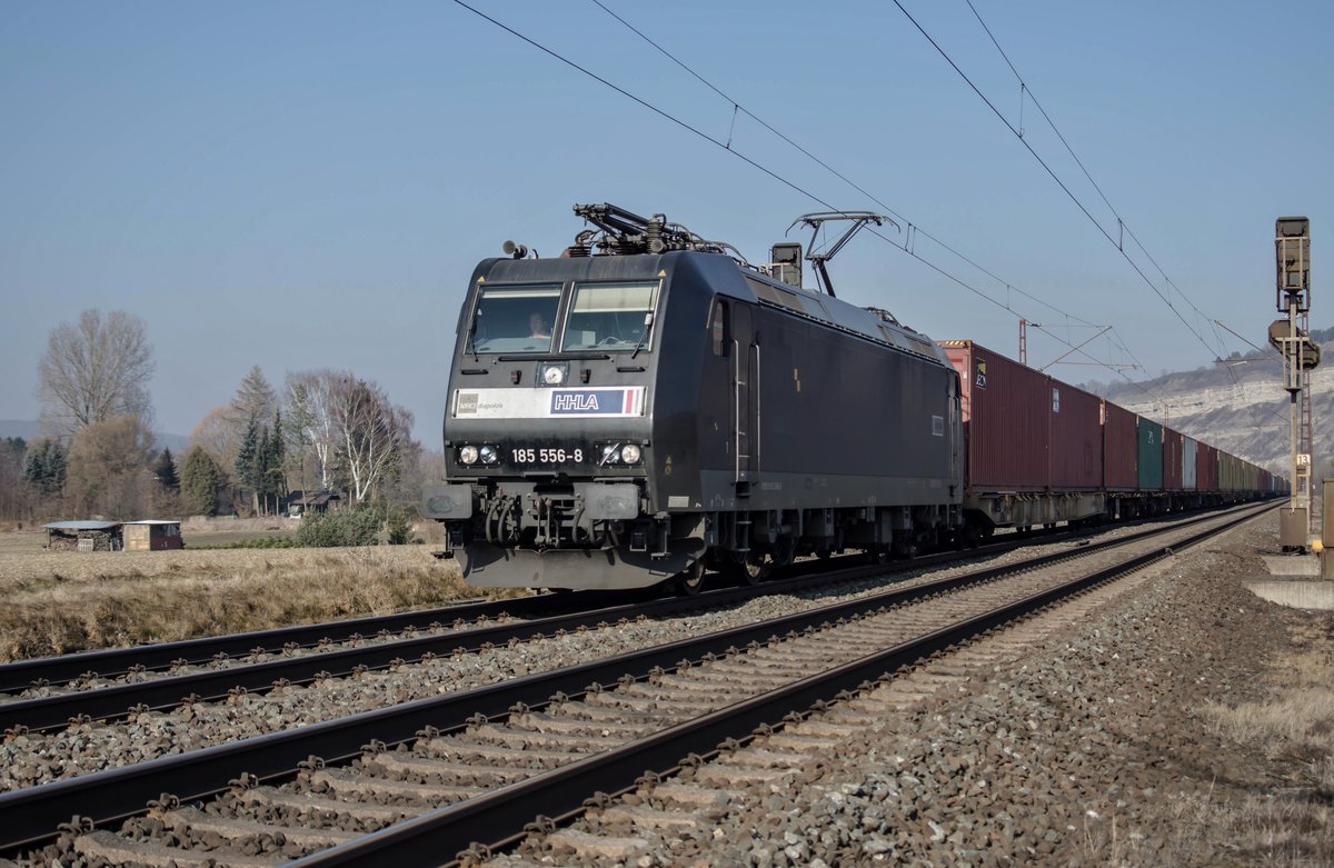 185 556-8 von HHLA ist am 15.02.2017 mit einen Containerzug in Richtung Würzburg bei Thüngersheim unterwegs.