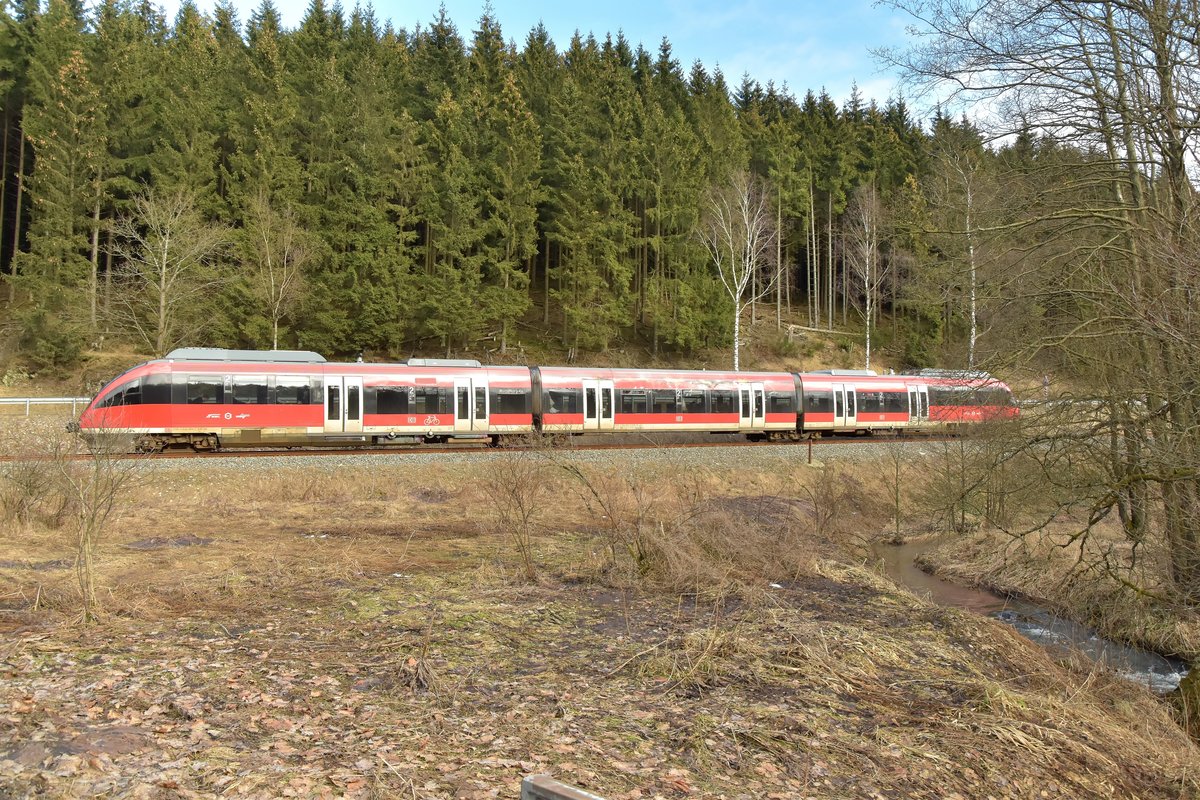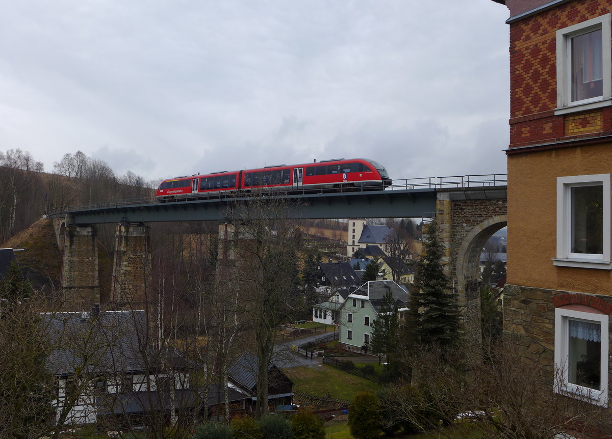 642 197 "Thermalbad Wiesenbad" hat als RB 80 (Cranzahl - Chemnitz Hbf) den Bahnhof von Cranzahl verlassen und befährt nun das Viadukt Cranzahl. Cranzahl, 22. März 2016