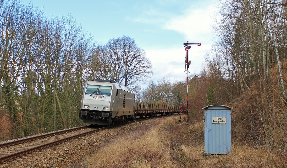 76 111 zu sehen am 28.02.17 in Pößneck mit dem Schrottzug von Cheb/Cz nach Könitz zum Stahlwerk Thüringen.