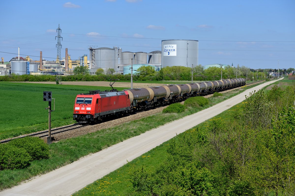 Auch im Osten Österreichs stets präsent ist die DB Baureihe 185. Am 20. April 2016 konnte ich die 185 354 mit einem Ganzzug, bestehend aus Kesselwagen der VTG, vor der Kulisse der Agrana Zuckerfabrik bei Tulln in Niederösterreich aufnehmen. Die Strecke durchs Tullnerfeld dient als Entlastung für die Westbahn - schwere Züge mit einer Zuglok ohne ETCS nehmen gerne diesen Weg.
