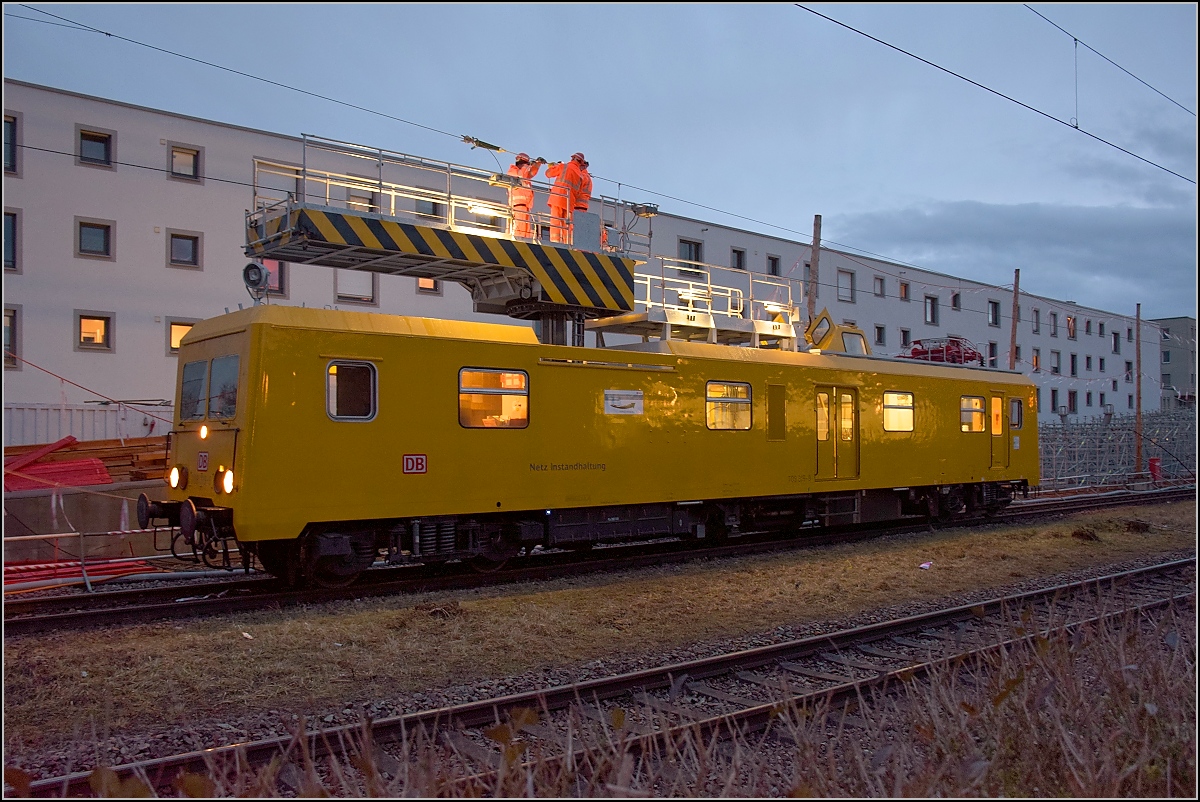 Bei Dämmerungseinbruch konnten die Reparaturarbeiten an der Oberleitung in Petershausen fortgesetzt werden. Hier stürzte der Kran auf die Oberleitung. An der Wiederherstellung der Oberleitung wird bereits parallel zu den Aufräumarbeiten neben dem Gleis gearbeitet. Konstanz, Februar 2017.