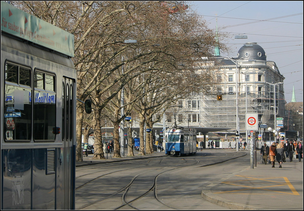 Dreiwagenzug, mit dem Be 4/4 487 und den beiden B4S 1470 und 1463, fährt zur Haltestelle der Linie 2 am Bahnhof SBB. Die Aufnahme stammt vom 27.02.2017.