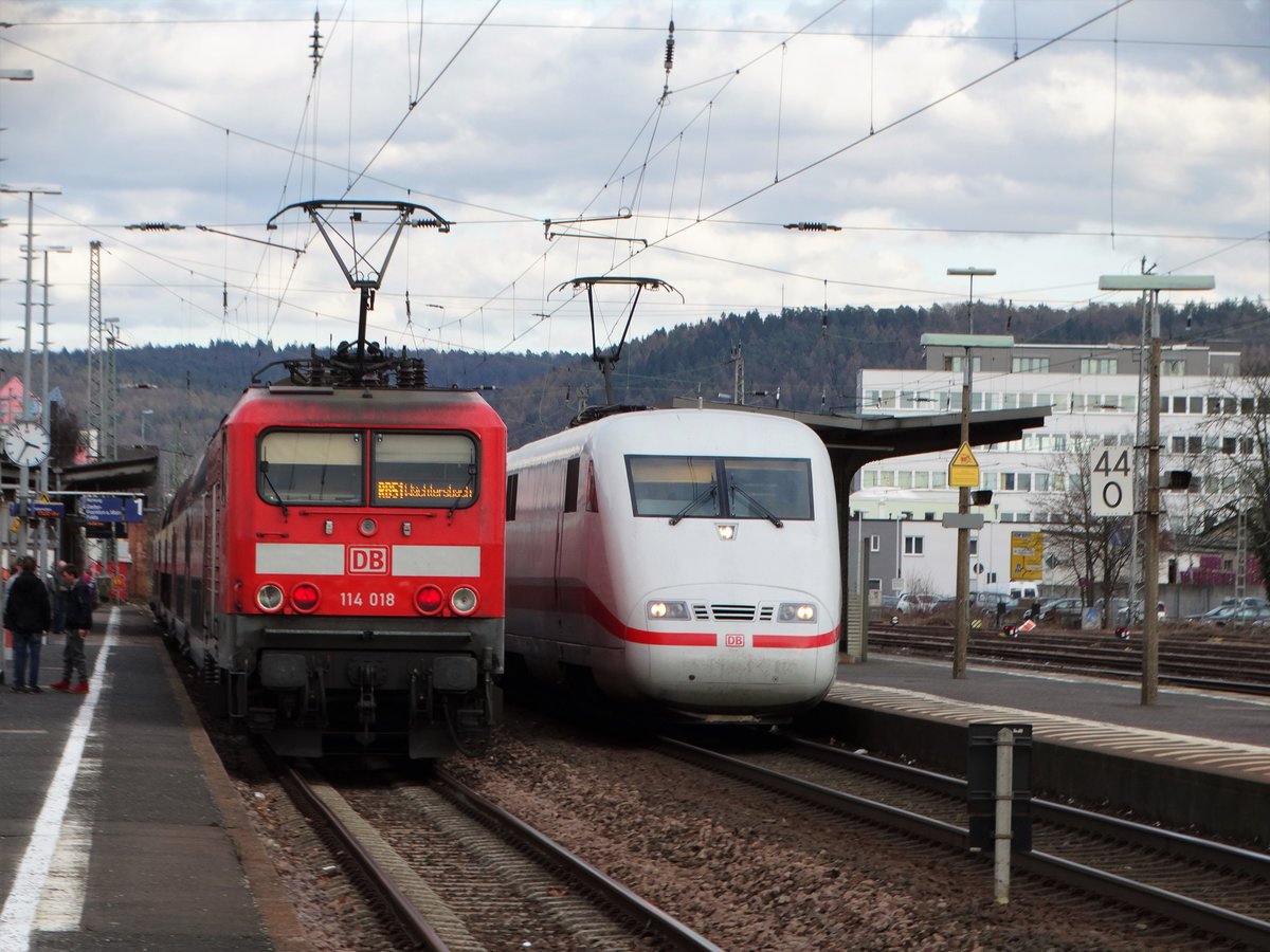 218 343-2 und 218 481-0 rücken vor um den IC nach Münster zu übernehmen. 628 901/629 001 wird in Kürze als Regionalbahn nach Aulendorf fahren. (14.02.2017)