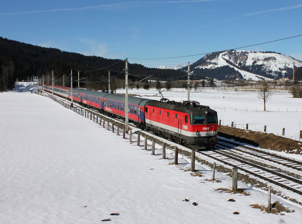 Die 1144 214 mit einem Turnuszug am 15.02.2014 unterwegs bei Hochfilzen.